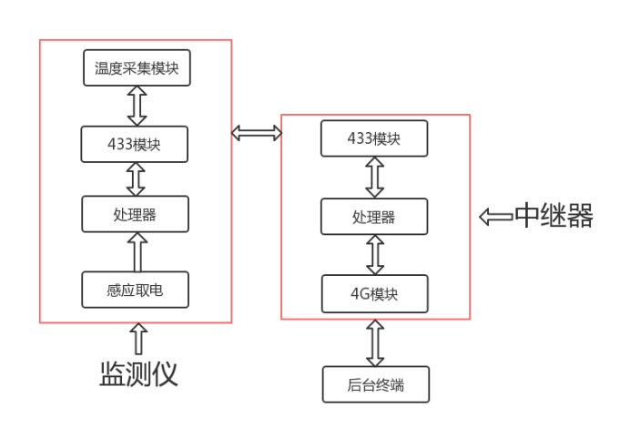 電纜頭測溫監(jiān)測儀通過自取電的方式進(jìn)行供電,節(jié)省了空間和成本,自取點(diǎn)也確保了設(shè)備的壽命不會因?yàn)楣╇姷脑蚩s短,在工作期間處理器把溫度采集模塊采集到的數(shù)據(jù)通過LORA模塊發(fā)往中繼器,中繼器上的LORA模塊接受到數(shù)據(jù)后處理器利用4G模塊把測溫?cái)?shù)據(jù)發(fā)往后臺系統(tǒng),完成一個完整的工作內(nèi)容。接地電流的采集也是同理,利用零磁通互感器采集電流,從而完成數(shù)據(jù)的上傳。