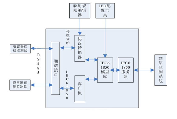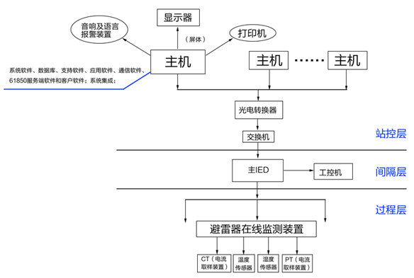 二、避雷器在線監(jiān)測(cè)儀接IED與后臺(tái)主機(jī)相連,實(shí)現(xiàn)數(shù)據(jù)上傳。